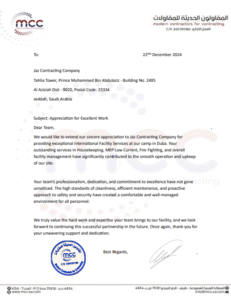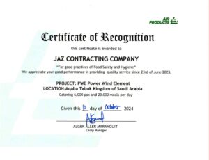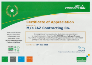 تفخر شركة جاز للمقاولات بالإعلان عن تلقيها خطاب تقدير رسمي من شركة AIR PRODUCTS، وذلك اعترافًا بأدائنا المتميز في تقديم خدمات إدارة المرافق الدولية في معسكر PWE TSF التابع لهم في منطقة البدع.